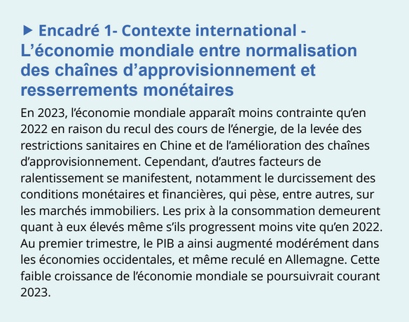 Au premier trimestre 2023, les tensions sur les prix persistent. Dans ce contexte, l’emploi salarié diminue légèrement pour la première fois depuis trois ans, avec 200 emplois de moins par rapport à fin 2022. Le secteur privé cesse en effet de porter la dynamique de l’emploi et voit disparaître 500 emplois, notamment dans l’intérim, alors que le secteur public se redresse. Les constructions de logements diminuent. Néanmoins, la fréquentation touristique continue sa progression et les créations d’entreprise restent à un niveau stable. Dans ce contexte, le chômage s’établit à 19 % de la population active.