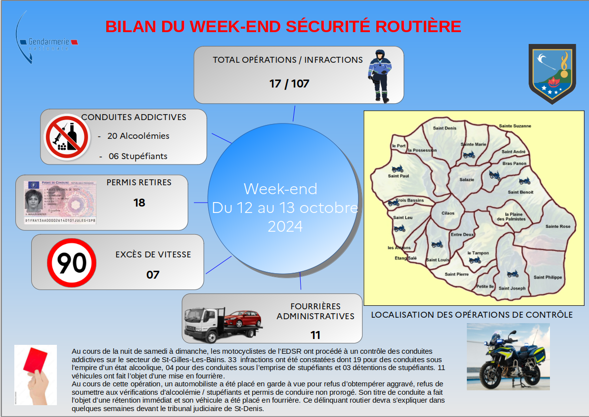 Les effectifs de la Direction Territoriale de Police Nationale de La Réunion ont réalisé sur le département 06 opérations de sécurisation et de sécurité routière au cours de ce week-end du 11 au 13 octobre 2024 permettant de relever 24 infractions dont 05 délits :