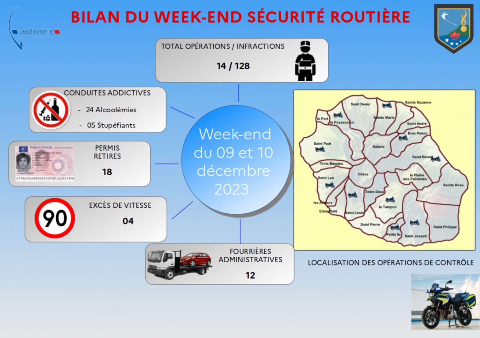 Les effectifs de la Direction Territoriale de Police Nationale de La Réunion ont réalisé sur le département 14 opérations de sécurisation et de sécurité routière au cours de ce week-end du 08 au 10 décembre 2023 permettant de relever 136 infractions dont 10 délits :