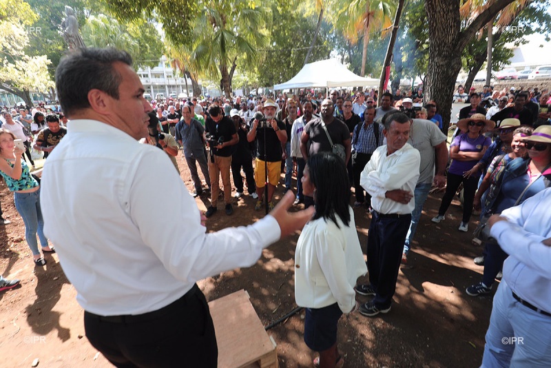 • 10h44 - Jean-Claude Lacouture, maire de l'Étang-Salé, vient de faire son apparition. Il écoute attentivement les envolées lyriques de Samuel Mouen qui évoque pêle-mêle dans le même discours Emmanuel Macron 🇫🇷 et la crucifixion de Jésus-Christ ✝. Le même orateur exalté appelle les Réunionnais à se révolter contre le Président de la République.