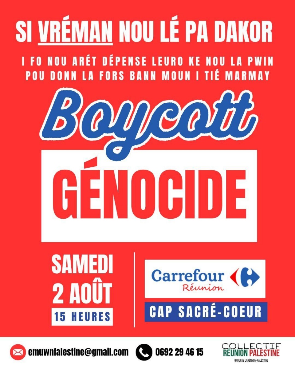 Le collectif dénonce la présence de Carrefour dans les colonies illégales de Palestine et l’accuse de soutenir l’occupation militaire israélienne, tout en "profitant des richesses d’un territoire ultramarin jugé néocolonisé". Il appelle les consommateurs réunionnais à boycotter l’enseigne, estimant que "chaque euro dépensé à Carrefour renforce un système colonial là-bas, mais aussi ici".