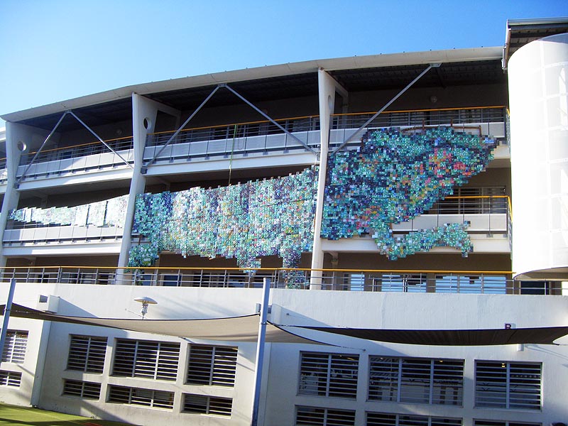C-REX, un caméléon de 26 mètres de long et 6,50 mètres de haut, est exposé actuellement sur la façade du collège Texeira da Motta de la Possession. "oeuvre artistique monumentale et héros de la protection de l'environnement, C-REX est réalisé à partir de 4 000 canettes ramassées au bord des routes" indique Murielle Subrero, Principale de l'établissement scolaire. Les visiteurs auront l'opportunité de rencontrer et d'échanger avec les créateurs et artistes de C-REX, (Béatrice Riviere-Nierinck et Michel Lebat) sur la genèse de cette oeuvre et sa portée en terme de développement et de protection de l'environnement lors des journées d'école ouverte : le mardi 11 mars 2014 de 08h30 à 12h00 et le jeudi 13 mars 2014 de 08h30 à 12h00 (Photo D.R.).