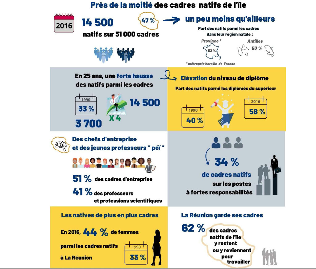 En 1990, seuls 33 % des cadres étaient nés sur l’île. En 25 ans, leur nombre a été multiplié par quatre, passant de 3 700 à 14.500 en 2016. Les besoins accrus de l’économie réunionnaise en main-d’oeuvre qualifiée ont favorisé l’essor des cadres.