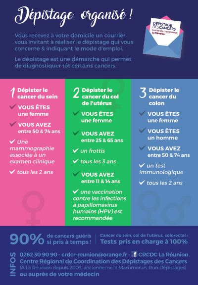 Le centre régional de coordination des dépistages des cancers de La Réunion a relancé le dépistage organisé des cancers. Suspendu en raison de la réglementation sanitaire liée au confinement, l'envoi des invitations aux tests en direction de la population concernée a repris depuis ce lundi 11 mai 2020. Nous publions ci-dessous le communiqué du centre de coordination
