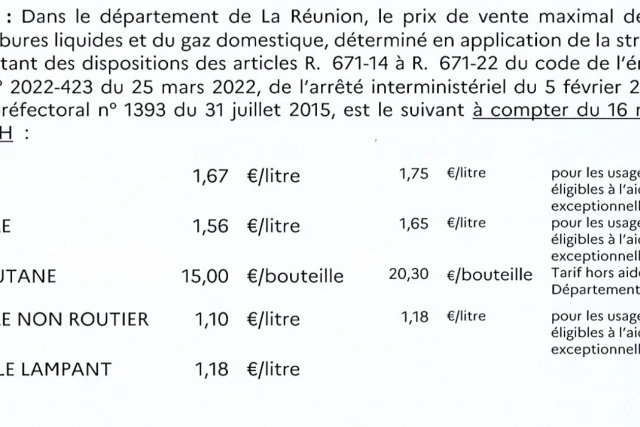 Alors que l’aide au carburant de l’Etat passe de 25 centimes à 8,33 centimes ce mercredi 16 novembre 2022, la préfecture publie un nouvel arrêté fixant le prix de vente maximal des hydrocarbures. Sans surprise, les prix à la pompe vont augmenter : le sans-plomb passe à 1,67 euro le litre, avec la remise de l’Etat, et le gazole passe à 1,56 le litre. La bouteille de gaz est toujours fixée à 15 euros par la Région. (Photo Photo RB imazpress)