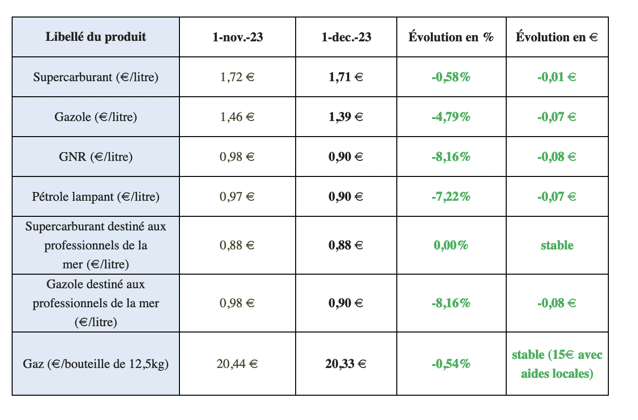 En décembre 2023, les prix maxima applicables à La Réunion seront les suivants :