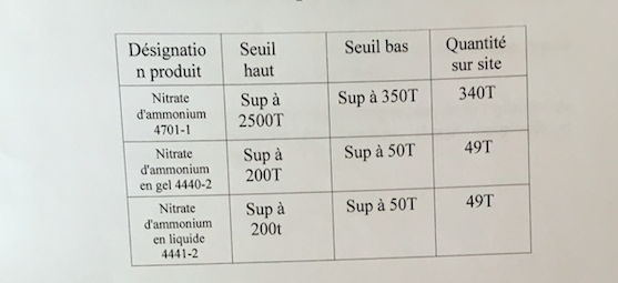 Effectivement, à chaque fois que le terme " nitrate d’ammonium " apparaît dans l’arrêté préfectoral, les quantités maximum déclarées par la SCPR sont juste en-dessous du seuil où tout devient plus contraignant. Regardez :