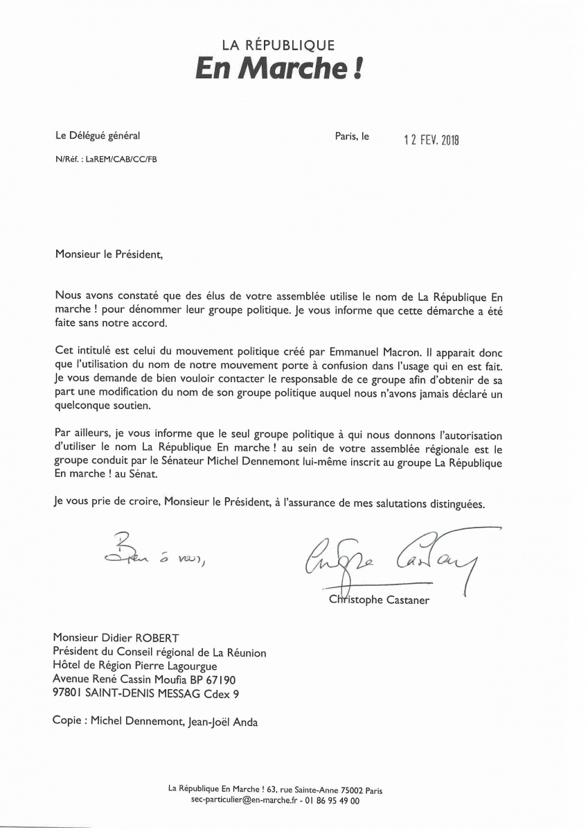 Dans un courrier adressé au président de Région Didier Robert, Christophe Castaner - délégué général du mouvement "En Marche" - a souhaité clarifier la situation de LREM (La République En Marche) à La Réunion. Il indique notamment que le responsable du groupe dans l'opposition régionale est le sénateur Michel Dennemont. "L'utilisation du nom de notre mouvement porte à confusion dans l'usage qui en est fait. Je vous demande de bien vouloir contacter le responsable de ce groupe" précise Christophe Castaner. La mise au point vise tout particulièrement Jean-Gaël Anda, récemment passé dans le camp de Didier Robert et qui a baptisé son groupuscule à la Région du nom de La République En Marche. Nous publions le courrier de Christophe Castaner ci-dessous.