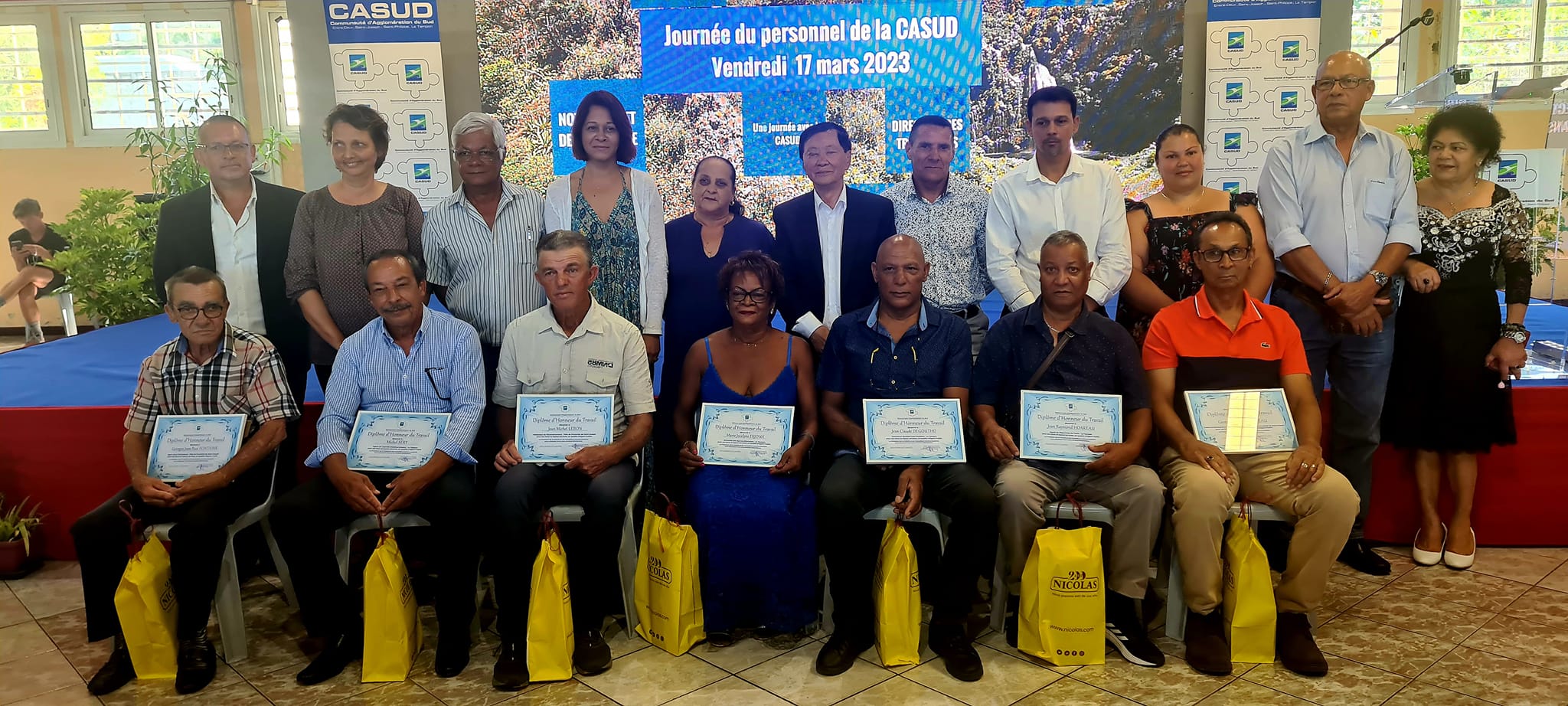 Lors de la journée de travail du vendredi 17 mars 2023 associant agents et élus, le Président de la Casud, André Thien Ah Koon et les élus communautaires présents ont chaleureusement félicités les agents de la CASUD, qui après de bons et loyaux services, sont partis à la retraite ces derniers mois. Parmi eux Mme Dijoux qui a effectué plus de 33 ans de service. Elle est entrée en 1990 au sein du GIS (Groupement Intercommunal du Sud basé d'abord à l'Etang-Salé). Le GIS a ensuite evolué en CCSUD avant de devenir la CASUD. (Photo : Casud)
