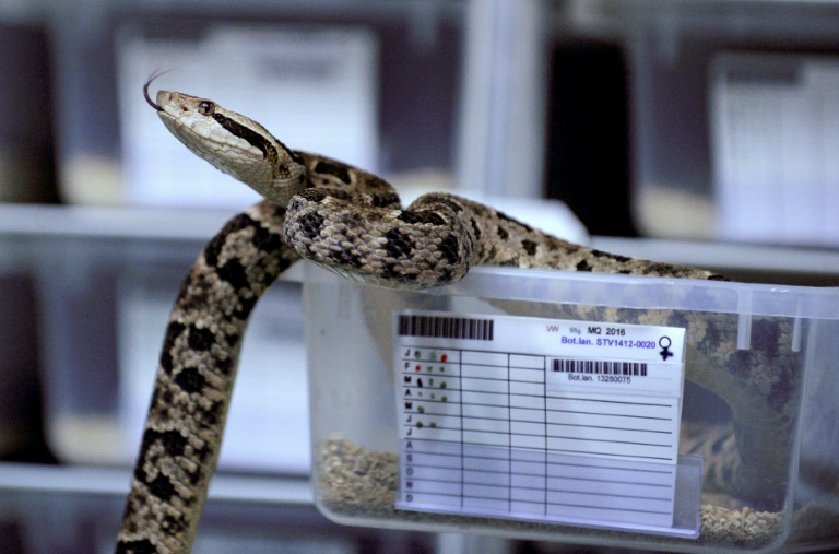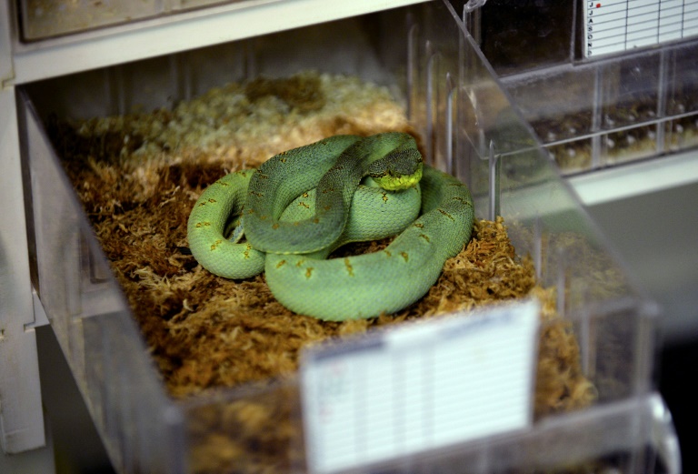 "Il signale qu'il est là", explique à l'AFP Rémi Ksas, guère impressionné par l'inquiétant bruit de crécelle. Crotales, vipères, mambas ou cobras: chez Venom World, la société de M. Ksas, 850 serpents d'une soixantaine d'espèces sont élevés, dans la quiétude d'une petite zone industrielle en Seine-et-Marne.