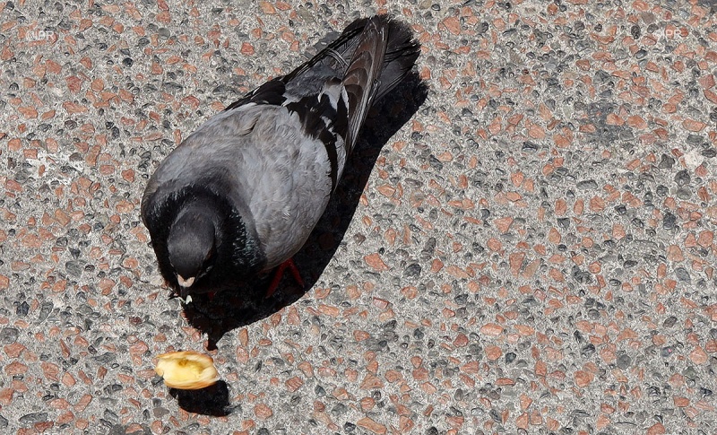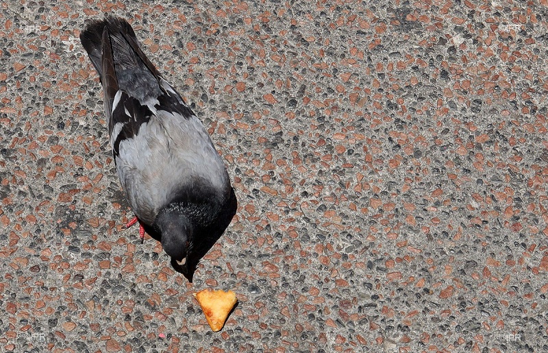 Et puis arriva un pigeon à la recherche d'une bonne fortune faite de pistaches ou de morceau de sandwich. Par ce hasard qui, chacun le sait, fait parfois bien les choses, , le volatile aux plumes lustrés se pose à coté du samoussa.