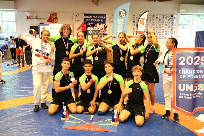 Du 26 au 28 mai 2025, deux équipes de l’ensemble scolaire Saint-Charles, à Saint-Pierre, ont brillamment défendu les couleurs de La Réunion lors du Championnat de France UNSS de lutte, organisé à Forges-les-Eaux. Résultat : un doublé exceptionnel pour la seconde année consécutive. Le collège et le lycée sont tous deux sacrés champions de France dans leurs catégories respectives. (Photo AS Lutte Saint-Charles)