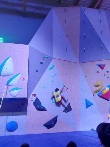 Quelques heures plus tard s’élançaient les U18 avec Tolani Etchar (7a L’Ouest), vainqueur des qualifications et seul grimpeur à réaliser les 8 blocs proposés sur ce tour ; une performance remarquable !!