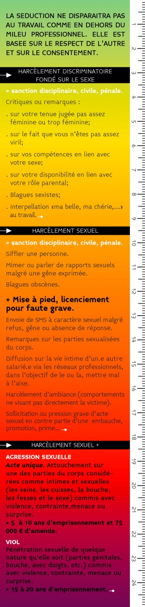 Chancégale a donc mis en place un outil de sensibilisation, "Le harcèlomètre", une jauge pour mesurer le degré de gravité des faits subis ou dont on est témoin. Un outil pour informer et alerter sur le harcèlement sexuel au travail et les sanctions encourues.