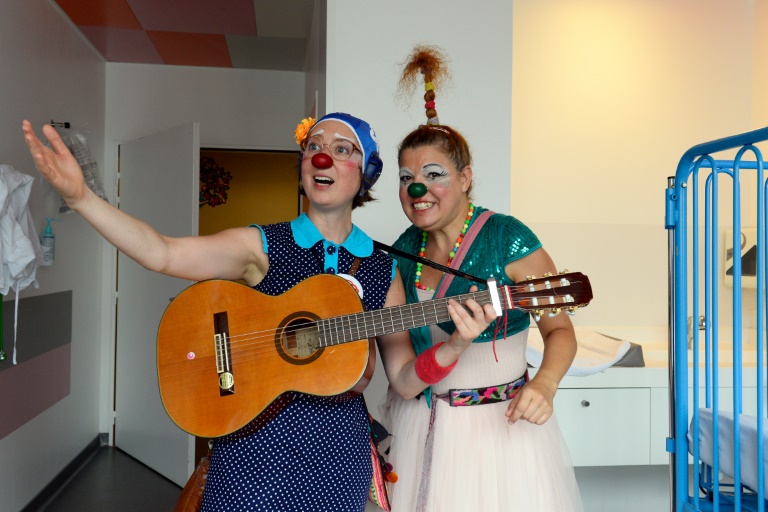 Robe de tulle blanche, couette en palmier sur la tête et visage peinturluré, Stéphanie Lassus-Debat laisse place à Gloum, son personnage, pour rendre visite aux enfants hospitalisés à Necker, à Paris. A ses côtés, Sarah Gautré, alias Tina Trompette, a, elle, mis son nez rouge et son bonnet de water-polo pour rejoindre le service de pédiatrie générale, guitare au bras.