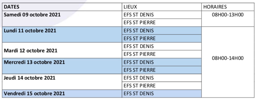 Suite aÌ un manque de ressources, les ouvertures de sites fixes pour le mois dâoctobre sont rĂ©amĂ©nagĂ©es.Retrouvez ci-dessous le planning des ouvertures des sites fixes de St Denis et de St Pierre du samedi 09 au vendredi 15 octobre 2021.