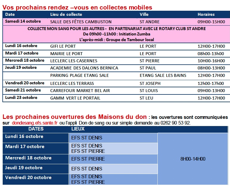 L’EFS La Réunion – Océan Indien connaît depuis plusieurs semaines une baisse de la fréquentation des collectes de sang, impacts directs des contre –indications temporaires dues aux épidémies saisonnières et aux retours de voyages. Il appelle chacun à s’engager, à relayer l’appel et à encourager leurs proches à donner leur sang. Tous les groupes sanguins sont importants.