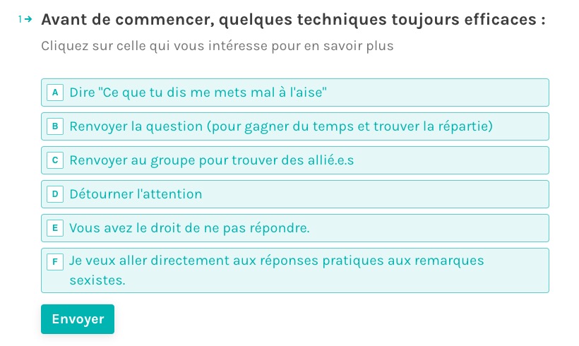Disponible en ligne, le guide propose dans un premier temps diverses techniques permettant de contrer une éventuelle remarque déplacée. Il est alors possible d'opter pour plusieurs solutions : "Renvoyer la question pour gagner du temps et trouver de la répartie", "Détourner l'attention" ou encore "Renvoyer au groupe pour trouver des alliés". Après avoir choisi l'une de ces techniques, NousToutes propose différents styles de réponses tels que "les chiffres, l'humour, l'inversion, ou le cynisme". A travers ce procédé, il est dès lors possible d'avoir accès à une répartie adaptée et personnalisée.