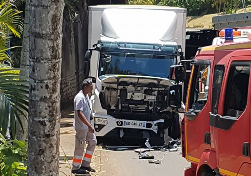 Ce jeudi 21 décembre 2017, une collision s'est produite entre un camion et une voiture à Bras-Panon. Les pompiers se sont dépêchés sur place. Selon des témoins sur le groupe Radar 974, le choc frontal aurait été particulièrement violent. Le CODIS indique qu'un homme blessé a été pris en charge (Photo : Radar 974)