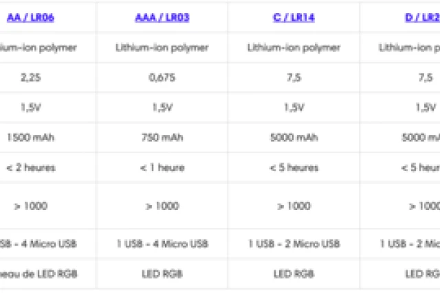 Les accumulateurs lithium-ion polymère sont très pratique. Il vous suffit de les recharger en micro USB depuis les différents supports USB possible : ordinateur, chargeur murale, batterie externe lors de vos déplacements. La marque fourni un câble multi connecteur micro USB vers USB afin de recharger l’ensemble de vos accumulateurs en même temps. La charge est 5 fois plus rapide que des accumulateurs Nimh.
