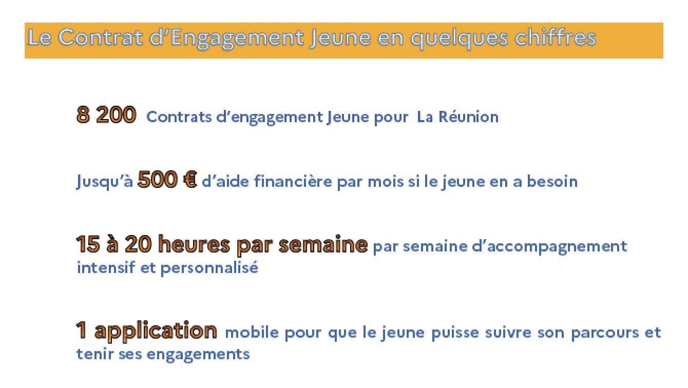Les Missions Locales : le Contrat dâEngagement Jeune prend la suite de la Garantie jeunes. Ce nouvel accompagnement sera dĂ©sormais proposĂ© dans les 4 missions locales et leurs antennes rĂ©parties dans lâensemble du territoire de La RĂ©union.