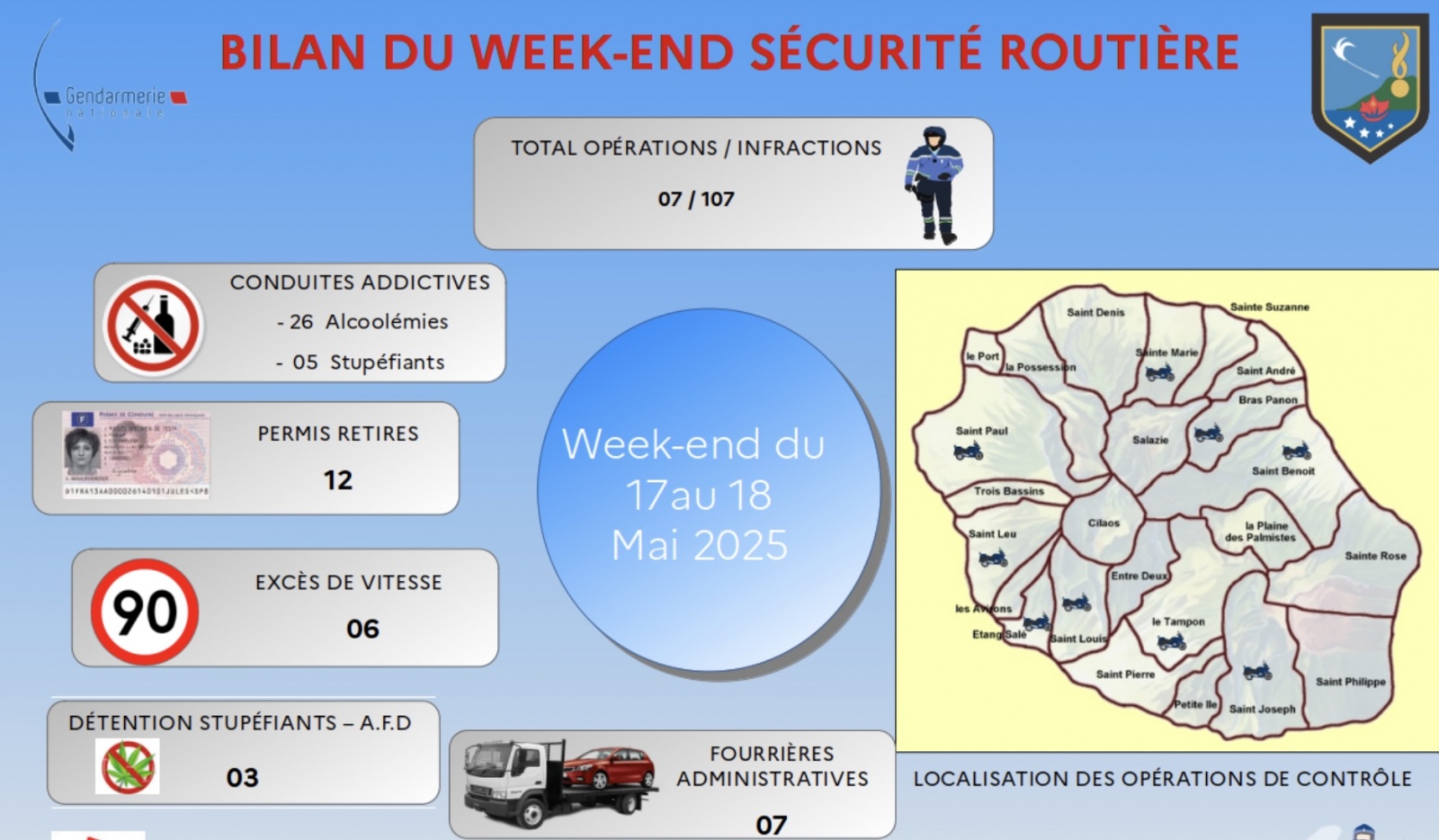 Au cours de la soirée de samedi, les motocyclistes de l'EDSR ont procédé à des contrôles des flux avant pour objet la recherche des conduites addictives sur les secteurs de Bras-Panon (Fête Foraine) et de Saint-Leu (Festival Tempo). 31 infractions ont été constatées dont 22 conduites addictives. 07 véhicules ont fait l'objet d'un placement en fourrière administrative.