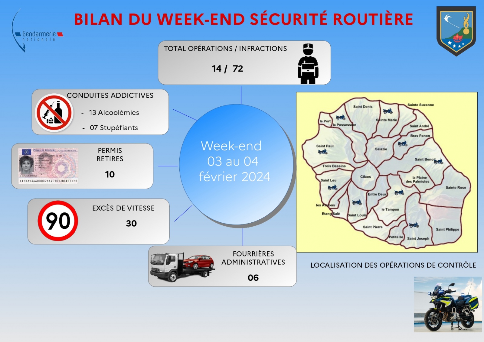 Les effectifs de l'Escadron Départemental de Sécurité Routière du Sud-Océan-Indien ont réalisé sur le département 14 opérations de sécurisation et de sécurité routière au cours de ce week-end du 3 au 4 février 2024 permettant de relever 72 infractions. De leur côté les policiers de la Direction Territoriale de la Police Nationale de La Réunion ont réalisé sur le département 18 opérations (photo rb/www.imazpress.com)
