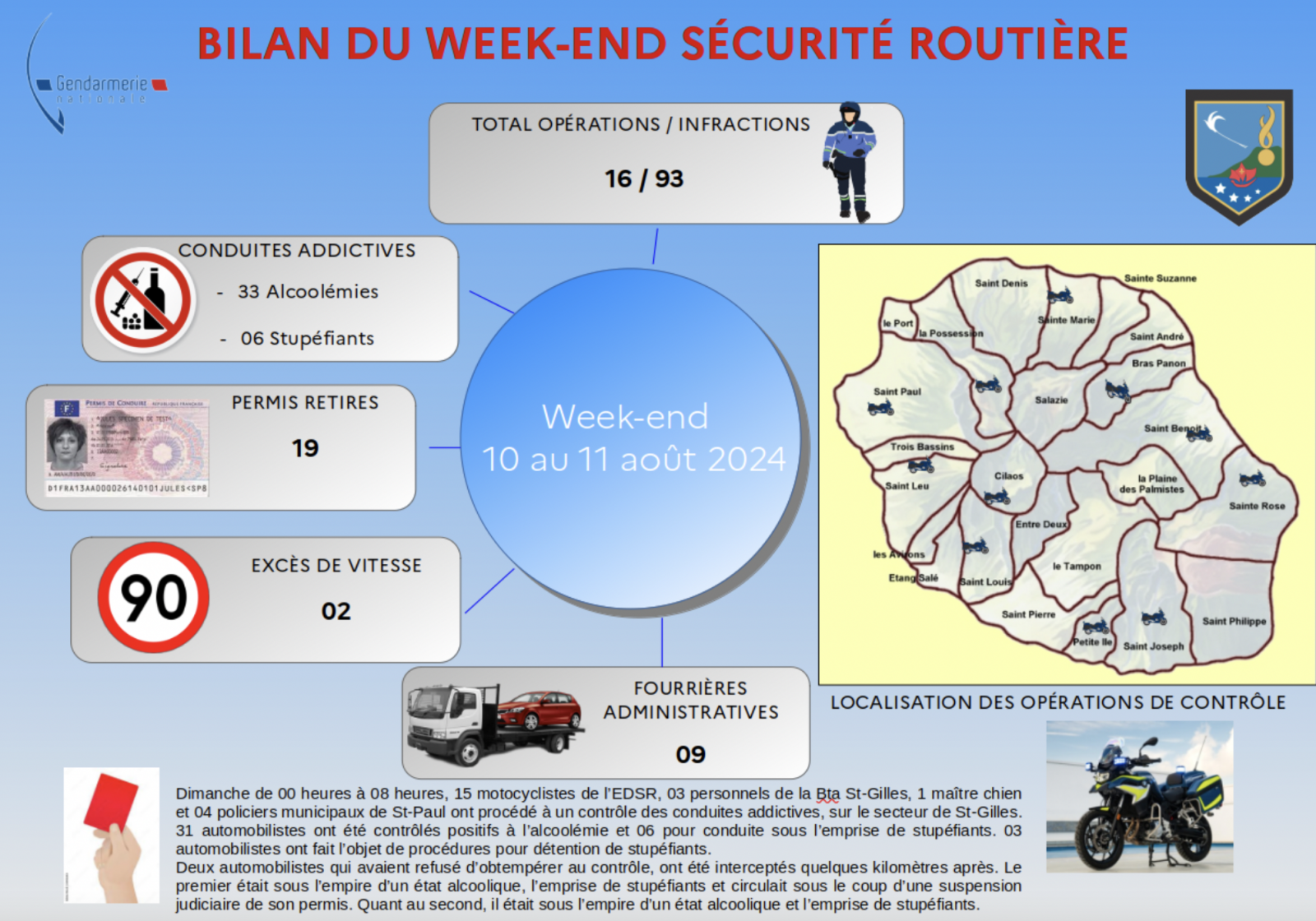 Les effectifs de la Direction Territoriale de Police Nationale de La Réunion ont réalisé sur le département 42 opérations de sécurisation et de sécurité routière au cours de ce week-end du 09 au 11 août 2024 permettant de relever 381 infractions dont 33 délits. Côté gendarmerie, on note 93 infractions. Ce dimanche, 31 conducteurs ont été contrôlés positifs à l'alcool et six aux stupéfiants. Deux automobilistes ont également refusé d'obtempérer avant d'être interceptés. Les deux conducteurs étaient sous l'empire de l'alcool et de stupéfiants (Photo : www.imazpress.com)