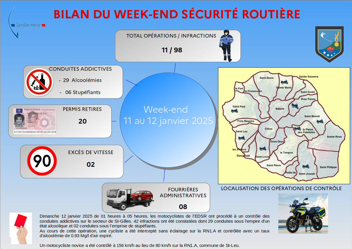 Les effectifs de police ont réalisé sur le département 42 opérations de sécurisation et de sécurité routière au cours de ce week-end du 10 au 12 janvier 2025 permettant de relever 399 infractions dont 29 délits. De leur côté, les effectifs de l'Escadron départemental de sécurité routière (EDSR) de La Réunion ont réalisé sur le département 11 opérations de sécurisation et de sécurité routière, permettant de relever 98 infractions. (Photo : www.imazpress.com)