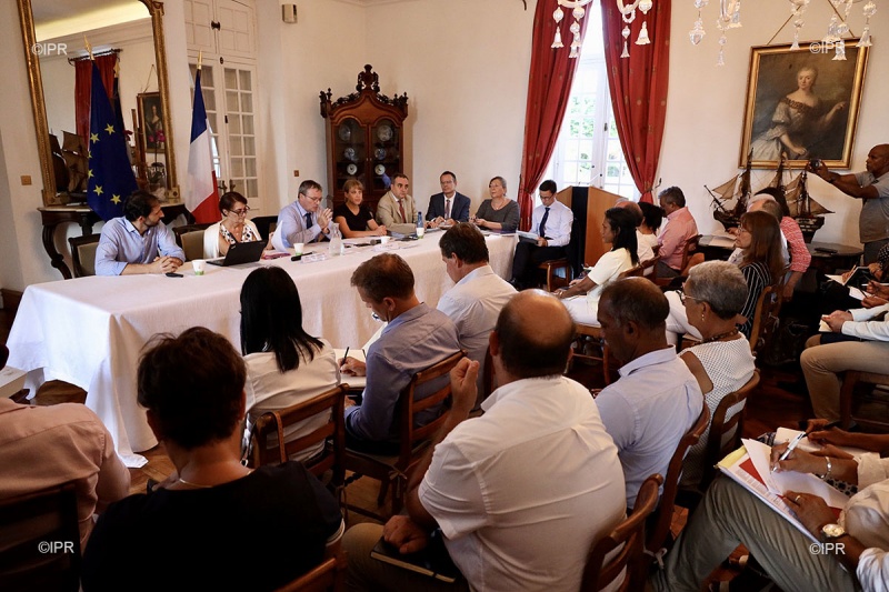Le préfet Jacques Billant a organisé une réunion d'information à la préfecture avec les élus et les parlementaires ce mardi après-midi 3 mars 2020. Au cours de cette rencontre, il a été annoncé que cinq cas suspects avaient été contrôlés à La Réunion. Tous les tests ont été négatifs et aucun cas avéré n'a été recensé. Ce lundi 2 mars le préfet a déjà eu un entretien avec Vêlayoudom Marimoutou, recteur de l'Académie de La Réunion. Les dernières mesures annoncées par la préfecture et l'ARS consistent à une meilleure préparation des hôpitaux et la mise en place d'un numéro vert départemental pour informer la population sur le nouveau coronavirus. Les mesures de prévention ont été rappelées, et le préfet a annoncé que 5 cas suspects avaient été vérifiés mais aucun cas de coronavirus n'est avéré. (Photos rb/www.ipreunion.com)