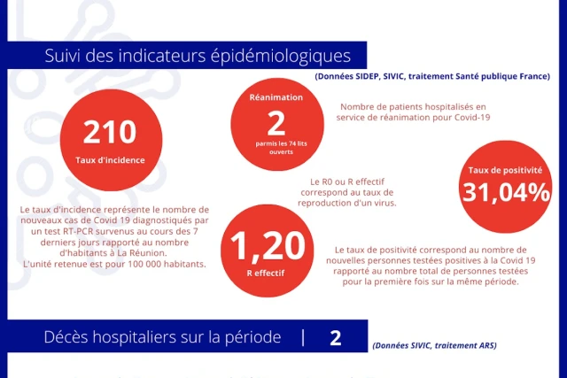 Du 5 au 11 décembre 2022, 2 décès et 1830 cas de Covid-19 ont été confirmés à La Réunion. Comme au niveau national, l'île enregistre une augmentation du taux d’incidence et du taux de positivité depuis plusieurs semaines. Cette semaine, on observe également une progression du taux de reproduction à 1,20 contre 1,13 la semaine précédente. À ce stade, il n’est toujours pas observé d’impact sur la situation hospitalière, avec un nombre stable de patients en réanimation à un niveau bas.