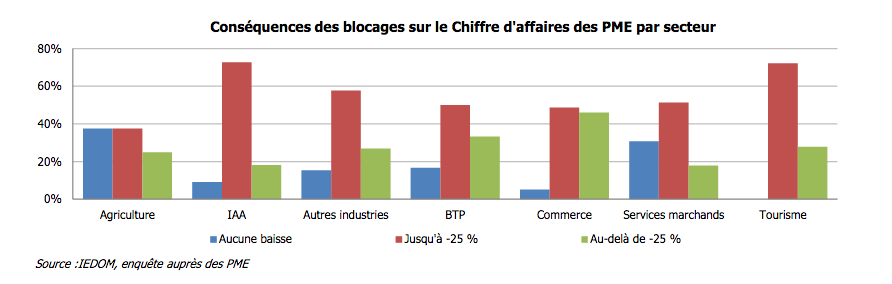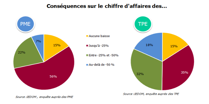 L’enquête menée par l’IEDOM révèle que la quasi-totalité des TPE et PME ont connu des perturbations, qui se sont traduites par des pertes de chiffre d’affaires. Les TPE ont davantage souffert de cette crise avec une dégradation plus importante de leur trésorerie.