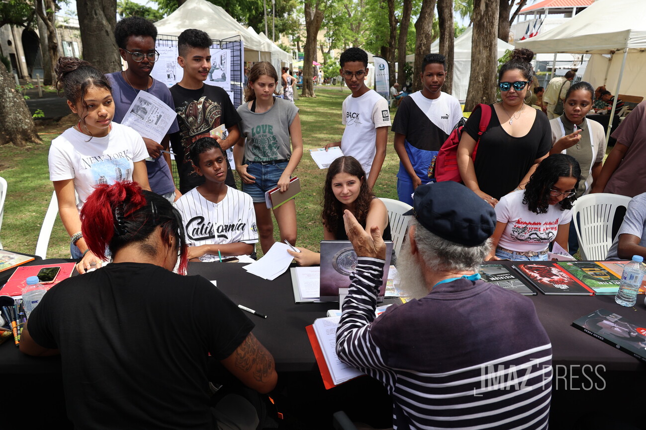 Ça bulle dans les jardins de la préfecture de Saint-Denis. Depuis jeudi 30 novembre et jusqu'à dimanche 3 décembre 2023 – se tient le Cyclone BD, un festival dédié à la bande dessinée. Et si l'on apprécie les bulles, ce n'est pas celles à boire… quoique, cet événement est l'occasion pour ceux qui ont soif de lecture – passionnés comme occasionnels, de buller à l'ombre d'un arbre, en s'enivrant des histoires relatées par ces auteurs et illustrateurs. Nous les avons rencontrés… (Photos : rb/www.imazpress.com)