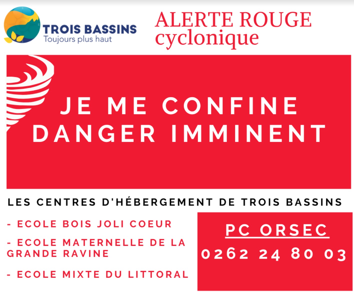 "Suite au déclenchement de l’alerte " rouge " du dispositif spécifique ORSEC Cyclones " Je me confine ", deux centres d'hébergement de la Ville de L’Étang-Salé seront opérationnels ce DIMANCHE 20 FÉVRIER 2022 dès 21 heures.