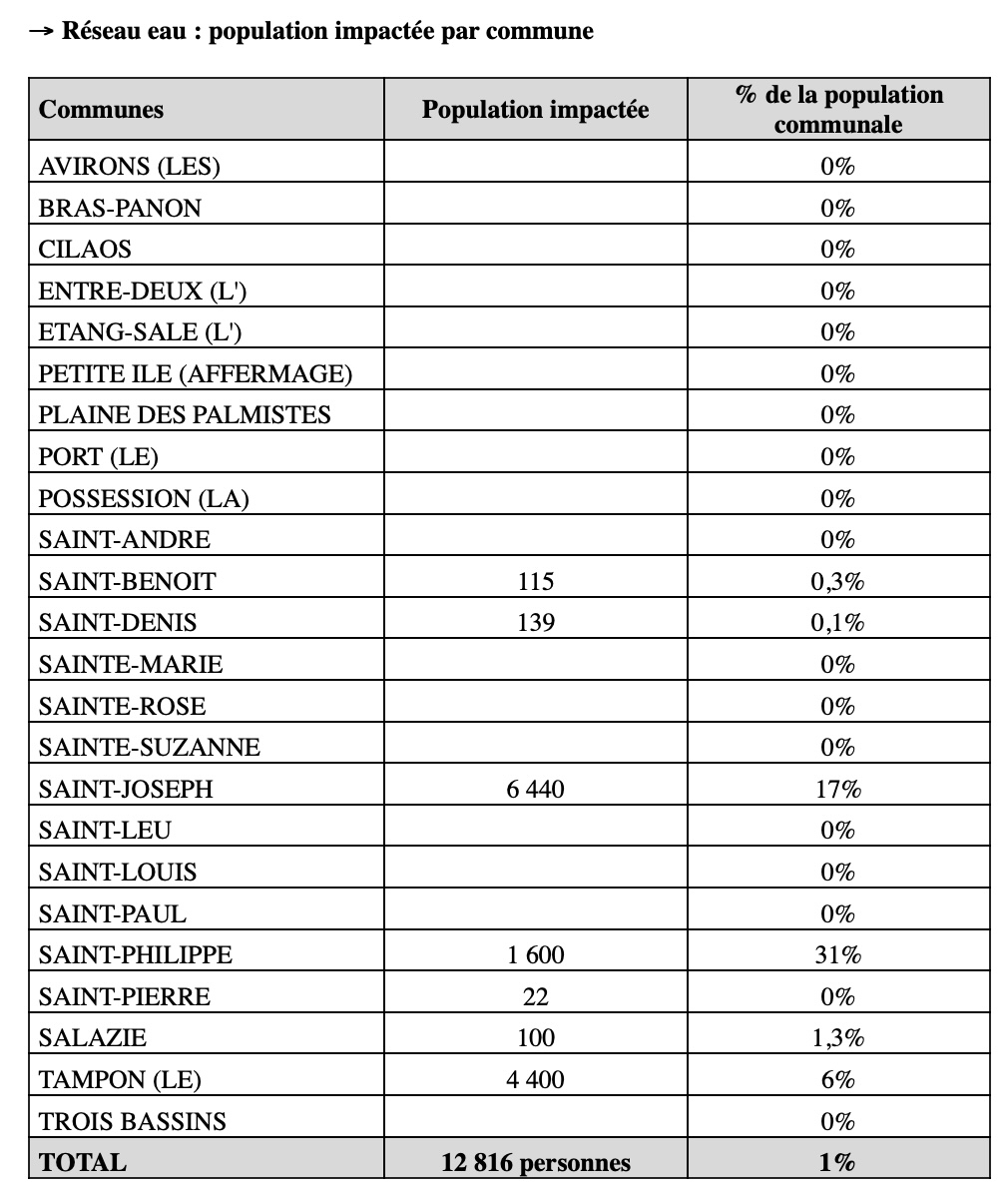 Concernant les coupures d'eau, aucune distribution de la part de mairie et dans les hauts de St-Denis nous n'avons vu aucun camion citerne par contre avec Mr Victoria à l'époque du cyclone Dina il y avait toute une organisation pour cela.