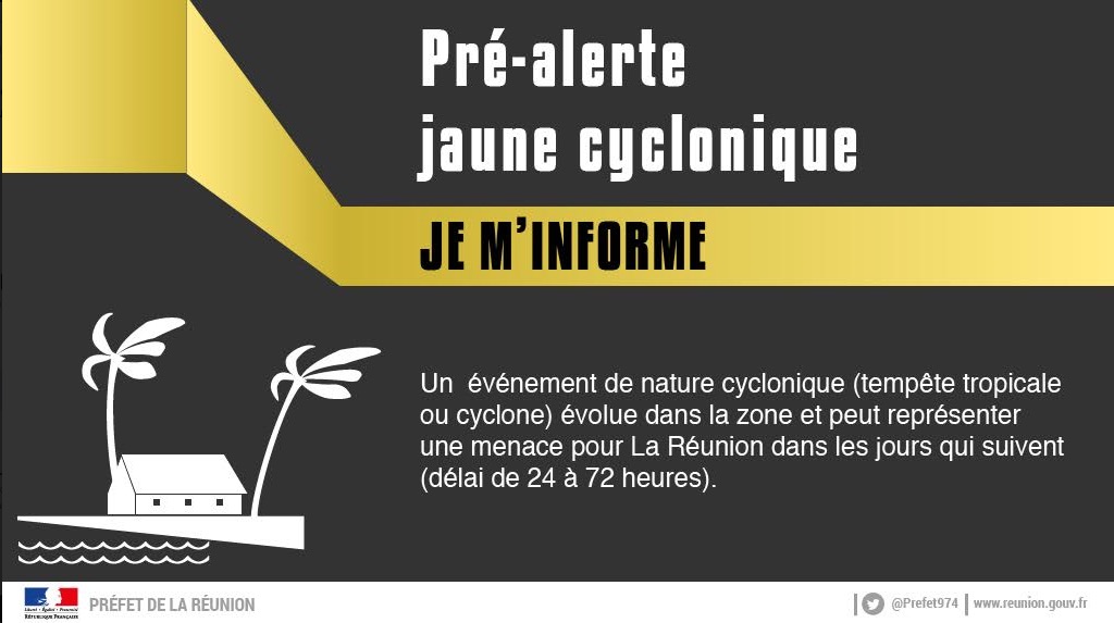 Ce système dépressionnaire pourrait occasionner une dégradation des conditions météorologiques à compter du dimanche 10 janvier soir et principalement le lundi 11 janvier. En conséquence, le préfet de la Réunion a décidé de déclencher le niveau " pré-alerte jaune cyclonique " du dispositif spécifique ORSEC* Cyclones à compter de ce jour, vendredi 8 janvier, à 17h.