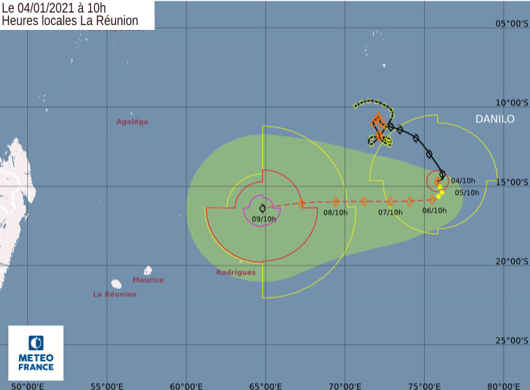 Danilo a perdu en intensité dans la matinée de ce lundi 4 janvier 2021. Après avoir atteint le stade de forte tempête dans la nuit de dimanche à lundi, le système a perdu en intensité et a rétrogradé au stade de tempête modérée. A 11h ce lundi, il s'était un peu rapproché de l'île et se trouvait à 2.235 km à l'est - nord - est de La Réunion. Il se déplace vers le sud - sud - ouest à 11 km/h et produit des rafales de vent soufflant à 95 km/h. Météo France s'attend à"une reprise de la trajectoire en direction générale de l'ouest" mardi soir ou mercredi. "Bien que ce scénario rapprocherait Danilo des Mascareignes, il est encore trop tôt pour parler d'une éventuelle menace compte tenu des incertitudes encore nombreuses sur cette prévision" soulignent les météorologues en ajoutant que "les erreurs moyennes de prévisions à cinq jours sont de l'ordre de 300 à 400 km". Aucune menace cyclonique n'est envisagée pour les prochaines 72 heures. (Photo : www.mtotec.com)