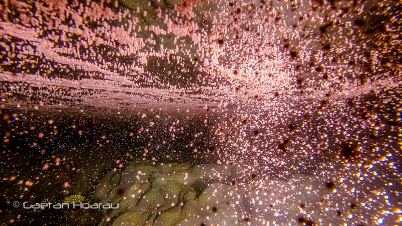Le spectacle est édifiant : récemment un photographe spécialiste de la ponte des coraux a diffusé des images magiques se déroulant sous les eaux. Des oeufs qui dansent, entraînés par la marée, forment une sorte de neige rose flottante. Dans le même temps, Gaëtan Hoarau a également pu filmer pour la première fois un corail nommé Montastra, dont les oeufs jaunes ressemblent presque à s'y méprendre à des petits ballons de football. (Photo : Gaëtan Hoarau)