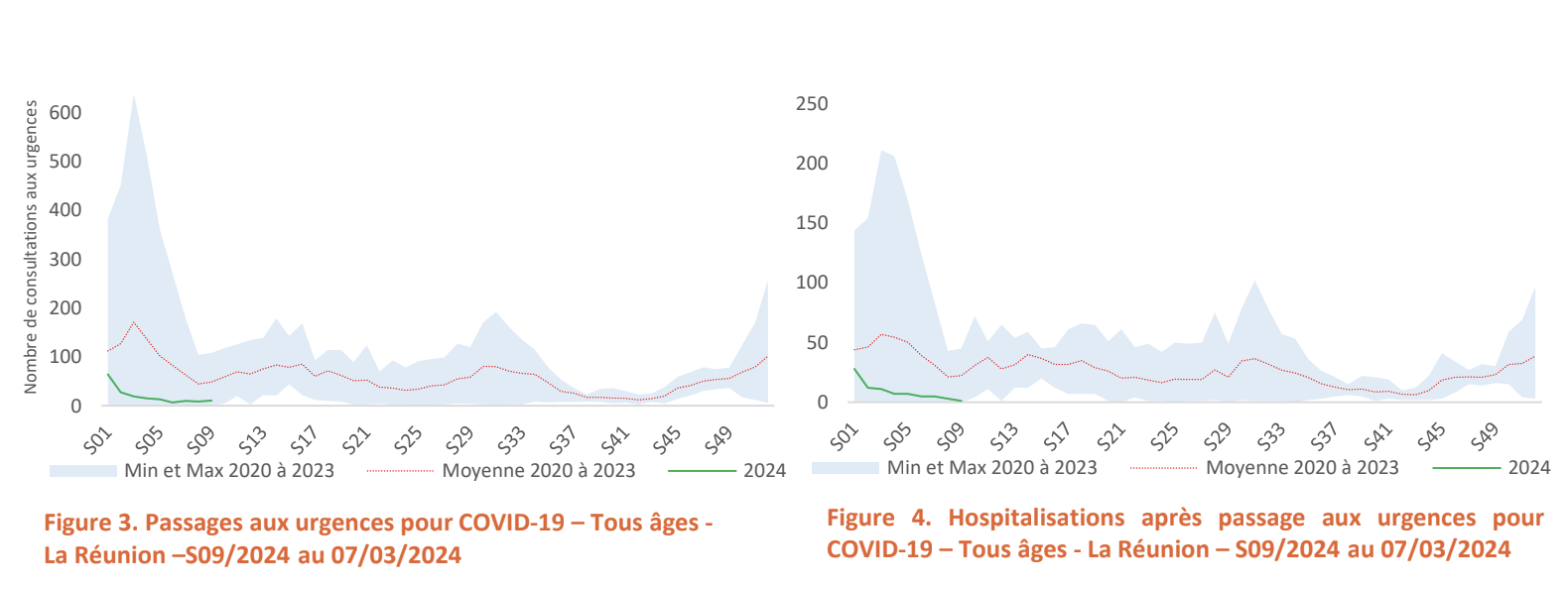 En S09, 11 passages aux urgences pour COVID-19 ont été comptabilisés contre 9 la semaine précédente. Le nombre de passages aux urgences pour motif de COVID-19 restait inférieur à la moyenne des passages en S09 entre 2020 et 2023.