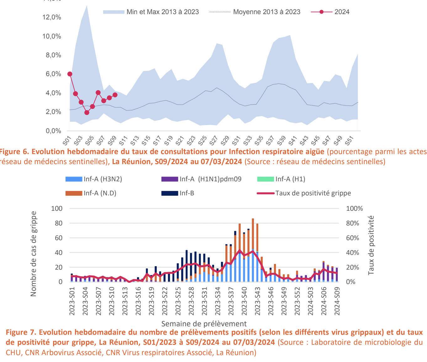 La surveillance virologique mise en place avec les données de virologie du laboratoire de microbiologie du CHU (CNR Arbovirus Associé, CNR Virus respiratoires Associé, La Réunion) et les laboratoires privés, montre un TP de la COVID-19 en diminution en S09.