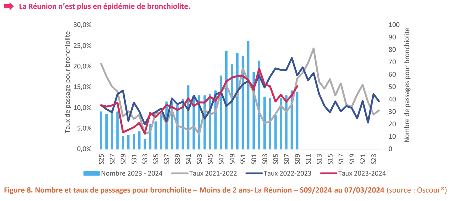 Concernant la surveillance virologique, le taux de positivité pour le VRS chez les moins de deux ans était en forte baisse à 23% en S09 (vs 43% en S08) avec une circulation majoritaire de VRS de type A.