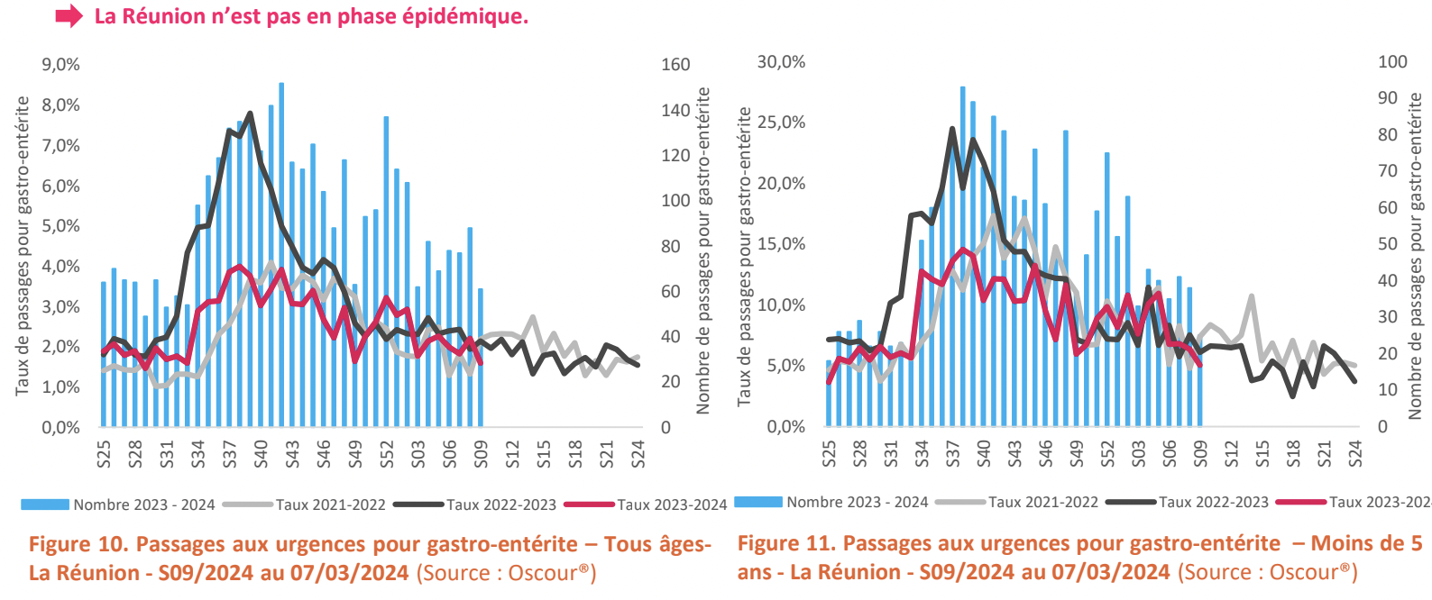 En S09, les passages aux urgences tous âges pour un motif de gastro-entérite étaient à la baisse avec 61 passages versus 88 passages en S08. Le nombre d’hospitalisations était stable avec 11 hospitalisations en S09 vs 13 en S08.