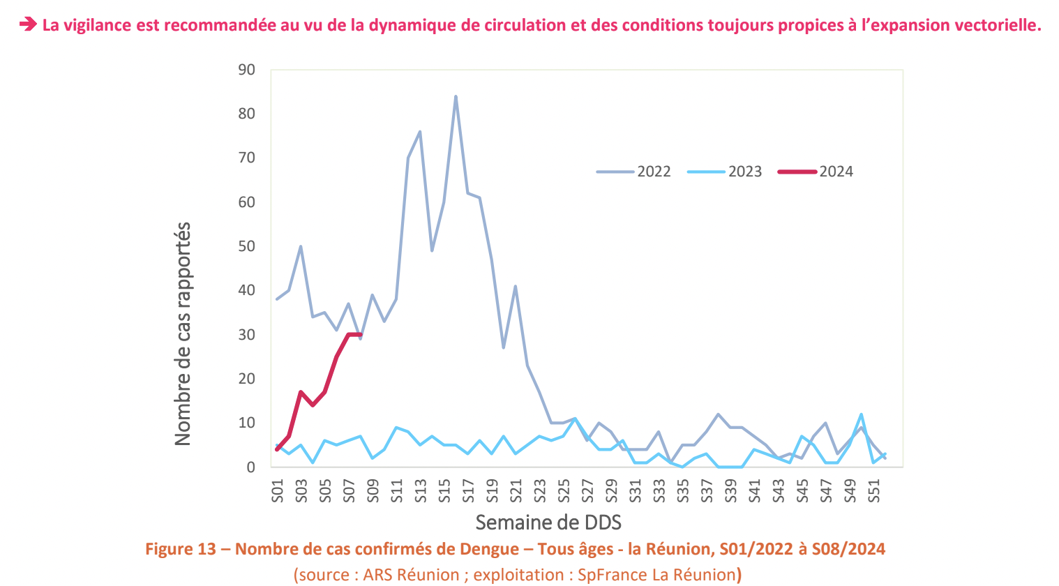 L’impact sanitaire reste à ce jour faible avec 19 passages aux urgences (CHU Sud et CHOR principalement) pour syndrome compatible avec la dengue depuis le début de l’année dont 4 en S08 et aucune hospitalisation signalée.