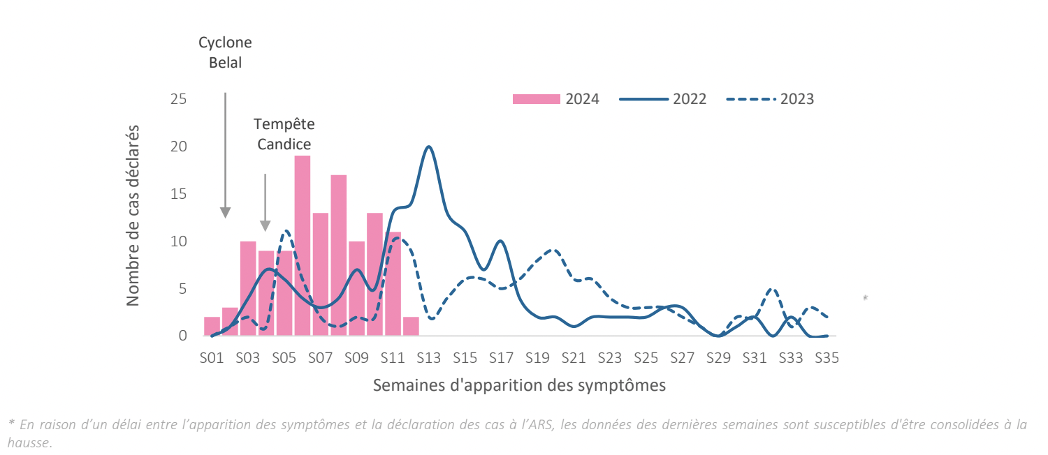 Données de la déclaration obligatoire : Depuis le 1 er janvier 2024, 119 cas de leptospirose autochtones confirmés biologiquement ont été déclarés à l’ARS, soit 6 cas de plus que la semaine précédente. Ce nombre de cas déclarés en 2024 est particulièrement élevé si on le compare aux deux dernières années (correspondantes aux incidences maximales enregistrées à La Réunion). Ainsi pour la même période de 2023, 38 cas avaient été déclarés pour 164 cas annuels et pour 2022, 53 cas déclarés pour 169 cas annuels).