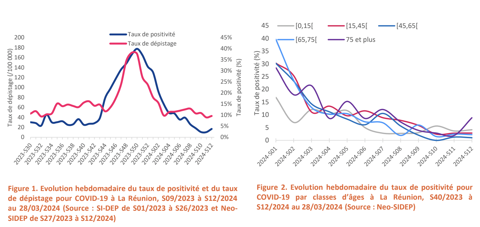 En S12, le taux de positivité (TP) était stable : 4% en S12 contre 2% en S11. Le taux de dépistage était aussi stable : 43 tests pour 100.000 habitants en S12 contre 40 tests pour 100 000 habitants en S11. L’analyse du taux de positivité par classes d’âges fait état d’une stabilité dans chacune d’entre elle à l’exception des 75 ans et plus qui était en augmentation.