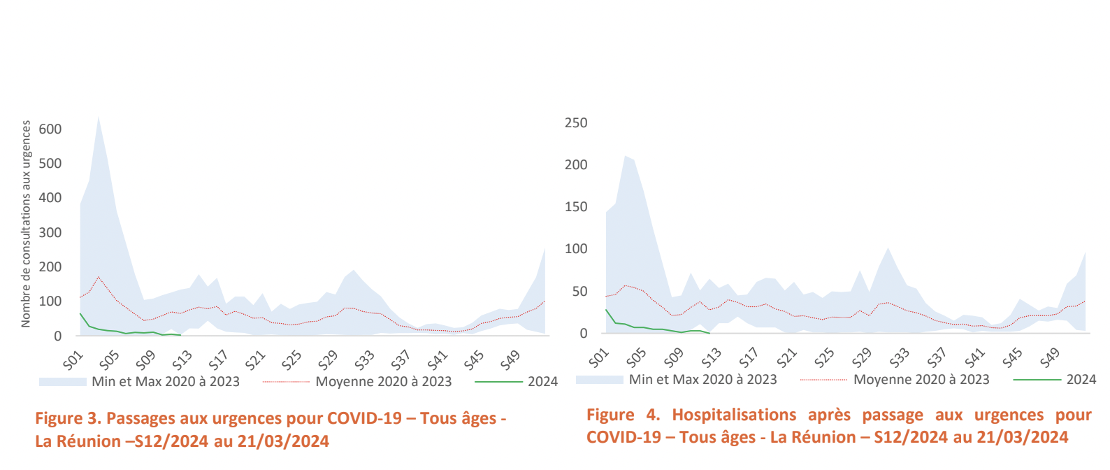 En S12, les passages aux urgences pour motif de COVID-19 étaient faibles et stables. En S12, 2 passages aux urgences pour COVID-19 ont été comptabilisés contre 5 la semaine précédente. Le nombre de passages aux urgences pour motif de COVID- 19 restait inférieur à la moyenne des passages en S12 entre 2020 et 2023.