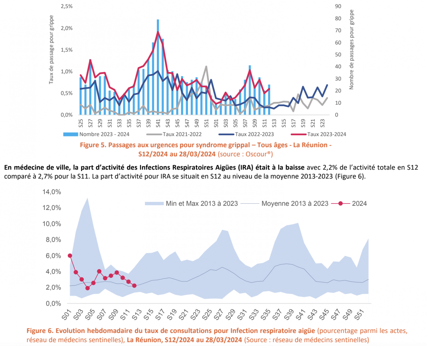 Le nombre de passages aux urgences était de 78 en S12 versus 89 en S11 soit une baisse de 12%. Le nombre d’hospitalisations était aussi en diminution avec 13 hospitalisations en S12 vs 20 en S11.