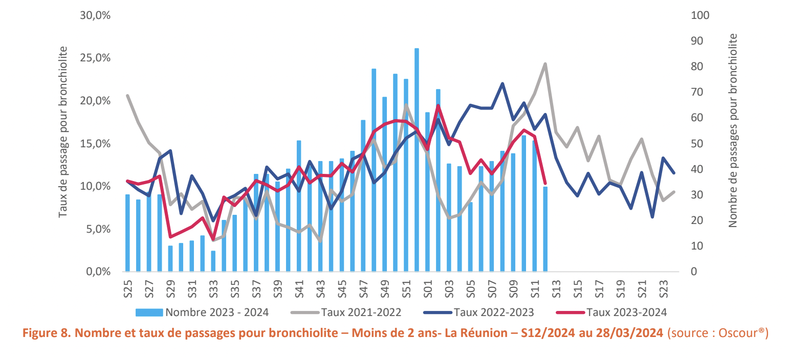 Concernant la surveillance virologique, le taux de positivité pour le VRS chez les moins de deux ans était en augmentation, et se situait à 42% en S12 vs 30% en S11 avec une co-circulation de VRS de type A et de VRS de type B.