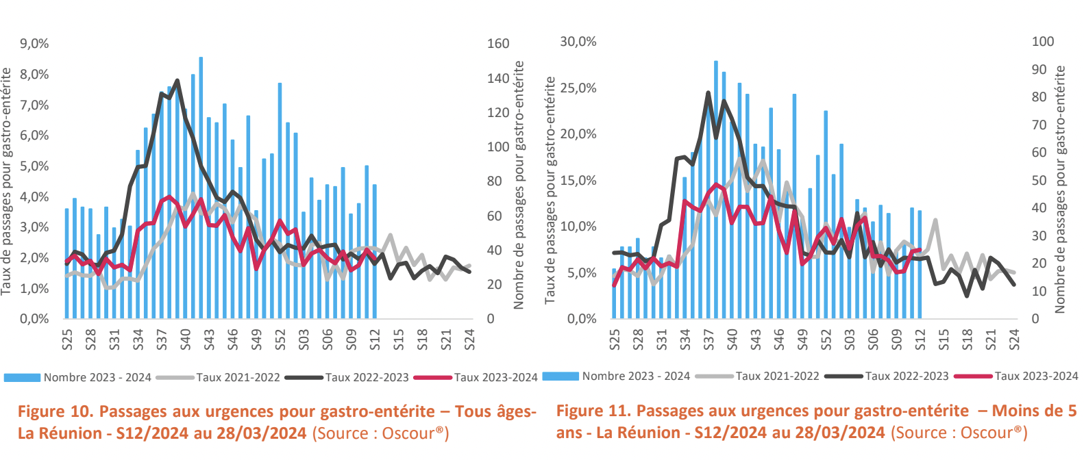 Chez les enfants de moins de 5 ans, les passages aux urgences pour un motif de gastro-entérite étaient stables en S12 (n=39) comparés à la semaine précédente (n=40). Les hospitalisations après un passage aux urgences demeuraient aussi stables avec 5 hospitalisations en S12 comme en S11.