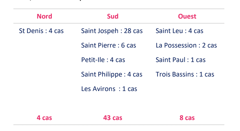 Les communes qui rapportaient un nombre de cas supérieur à 5 étaient : Saint-Pierre (21 cas) ; Saint-Louis et Saint-Paul (respectivement 14 cas) ; Le Tampon (12 cas) ; Saint-Joseph et Saint-Benoit (respectivement 10 cas) ; Petite-Ile (8 cas) et Saint-Leu (7 cas).
